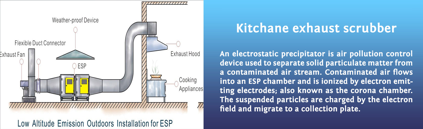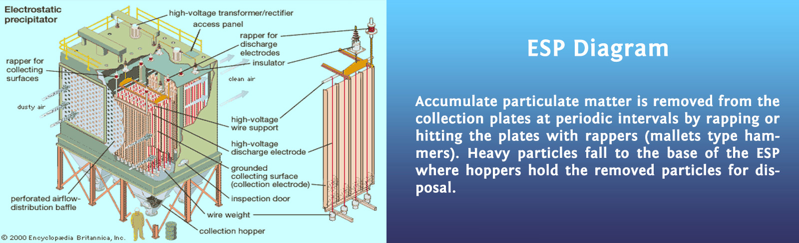 An electrostatic precipitator is air pollution control device used to separate solid particulate matter from a contaminated air stream. Contaminated air flows into an ESP chamber and is ionized by electron emitting electrodes; also known as the corona chamber. The suspended particles are charged by the electron field and migrate to a collection plate. Accumulate particulate matter is removed from the collection plates at periodic intervals by rapping or hitting the plates with rappers (mallets type hammers). Heavy particles fall to the base of the ESP where hoppers hold the removed particles for disposal.