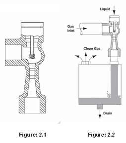 The Fig. 2.2 Liquid Gas Separator is a device to separate the entrained gas and liquid discharged from a Fig. 2.2 Vent Gas Scrubber. It operates on the gravity principle with the liquid directed to the bottom to run out a drain opening while the gas must make a 180 degree change of direction to exit through a top outlet. The unit is sized to allow low gas velocity so that gravity separation can be achieved.